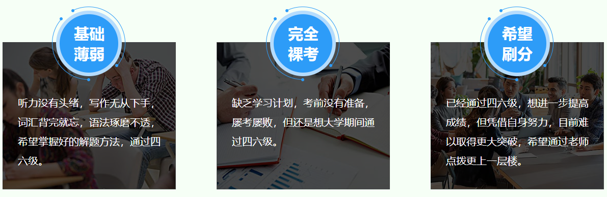 新东方大学生英语四六级培训机构,专业大学英语四级培训,大学英语六级培训,系统方法帮您提升英语成绩,根据学员基础开设不同班型,英语四六级全程班,英语四六级强化班、英语四六级冲刺班,线下和线上相结合,适用于各类学员!